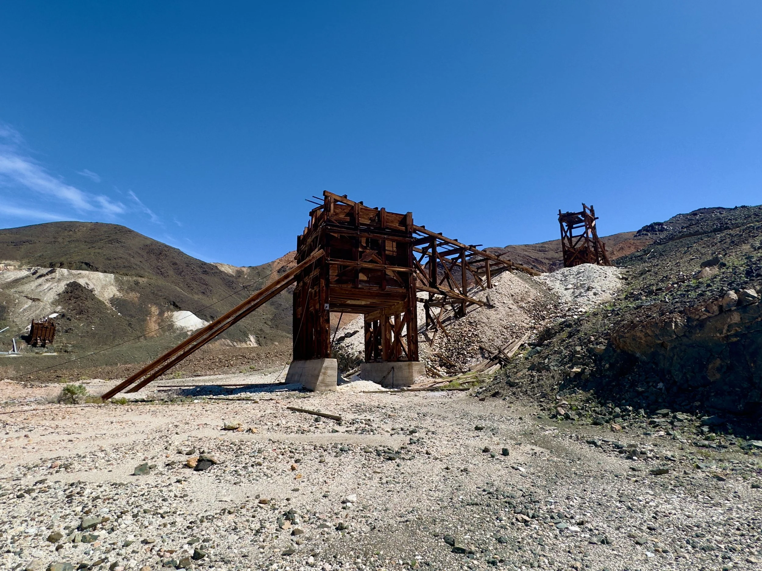 One of the headframes of the War Eagle Mine in Tecopa, California. Standing here since the 1920s this incline shaft accessed the rich multi-metal ore body below. An integrated ore bin allowed rapid loading of the narrow gauge mine railroad that connected the various shafts and adits of this large mining complex.